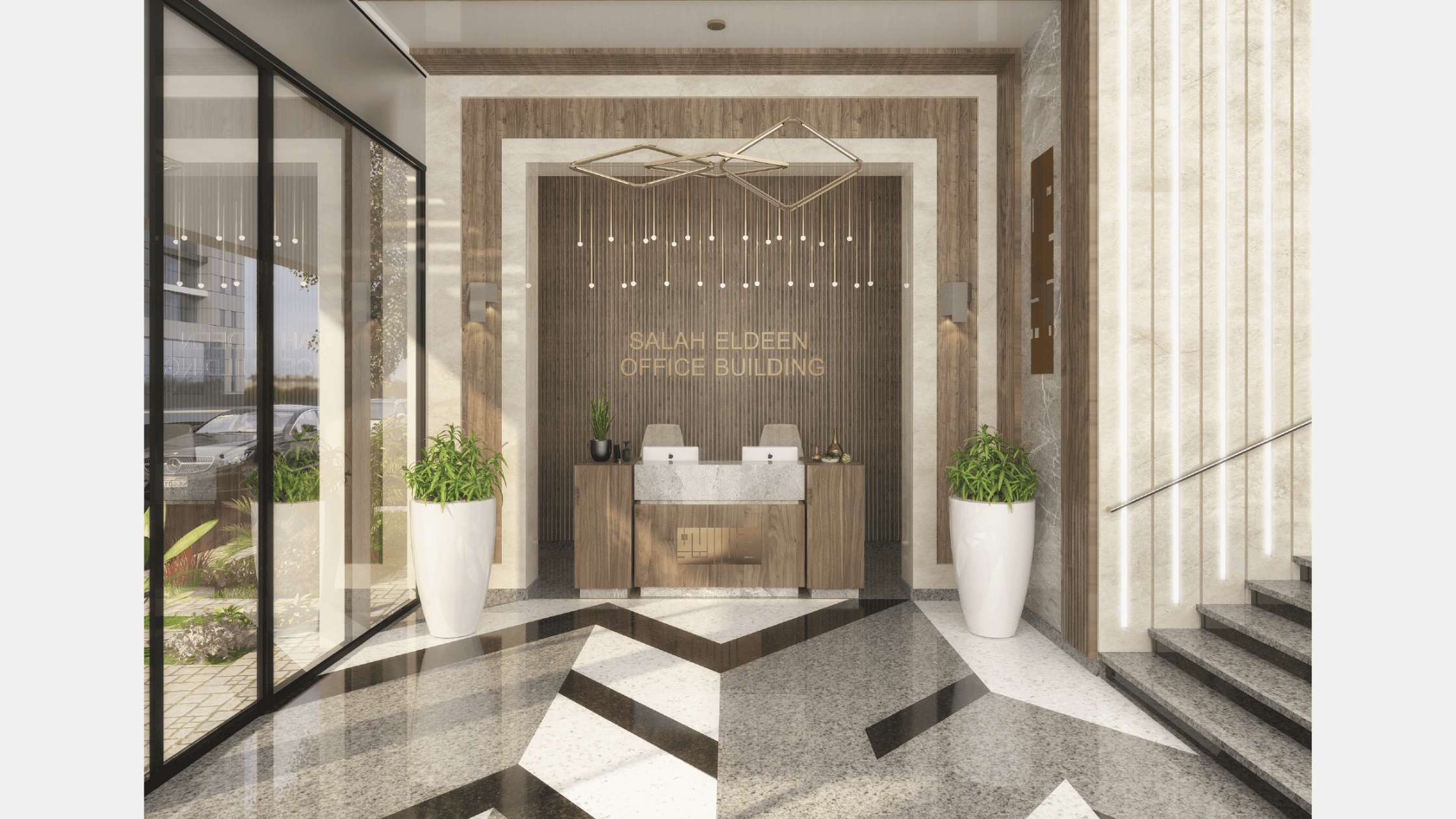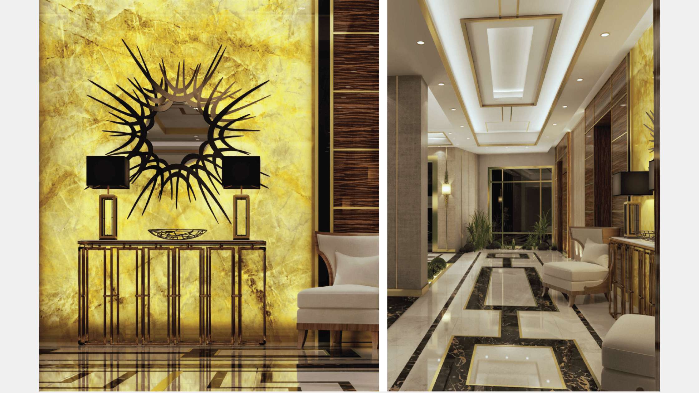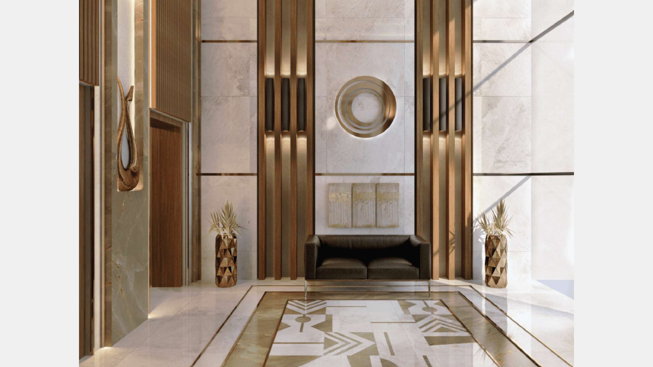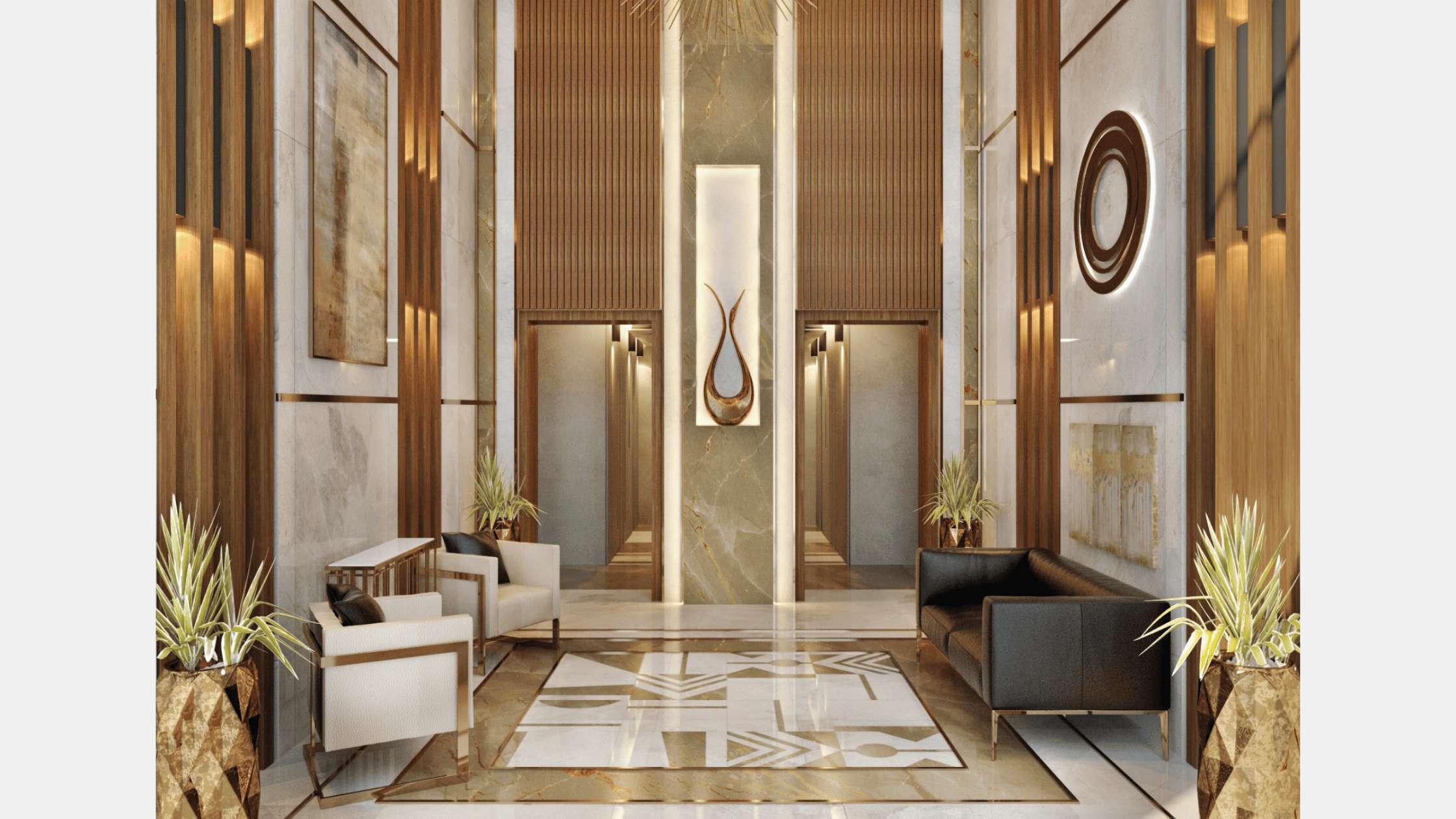 Our Conceptual design for the entrance of the building aims to create a luxurious design for such a luxurious compound that reflect in the mean while the sun theme of the compound . And create this through golden marbles and wooden strips and make the logo centralize these facades to strengthen the identity of the compound.