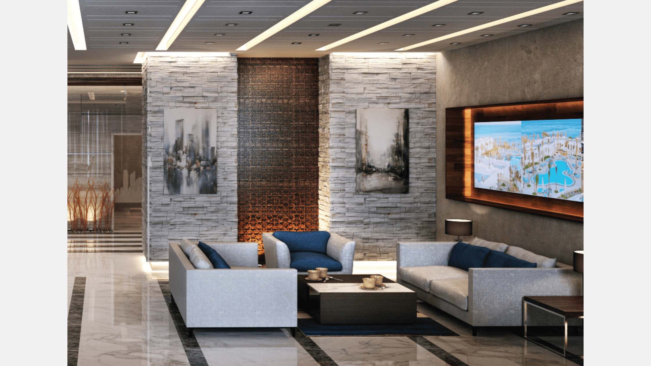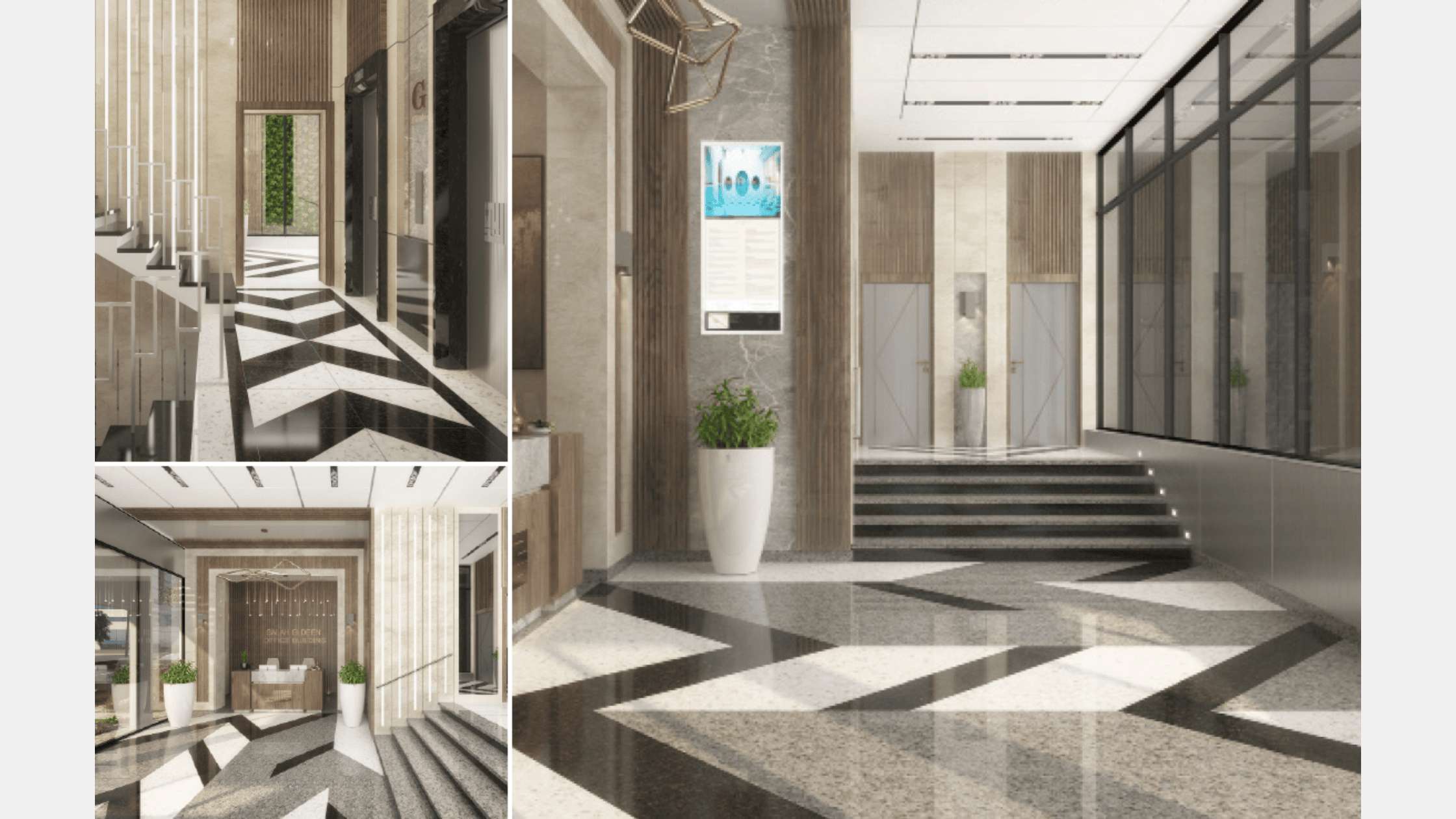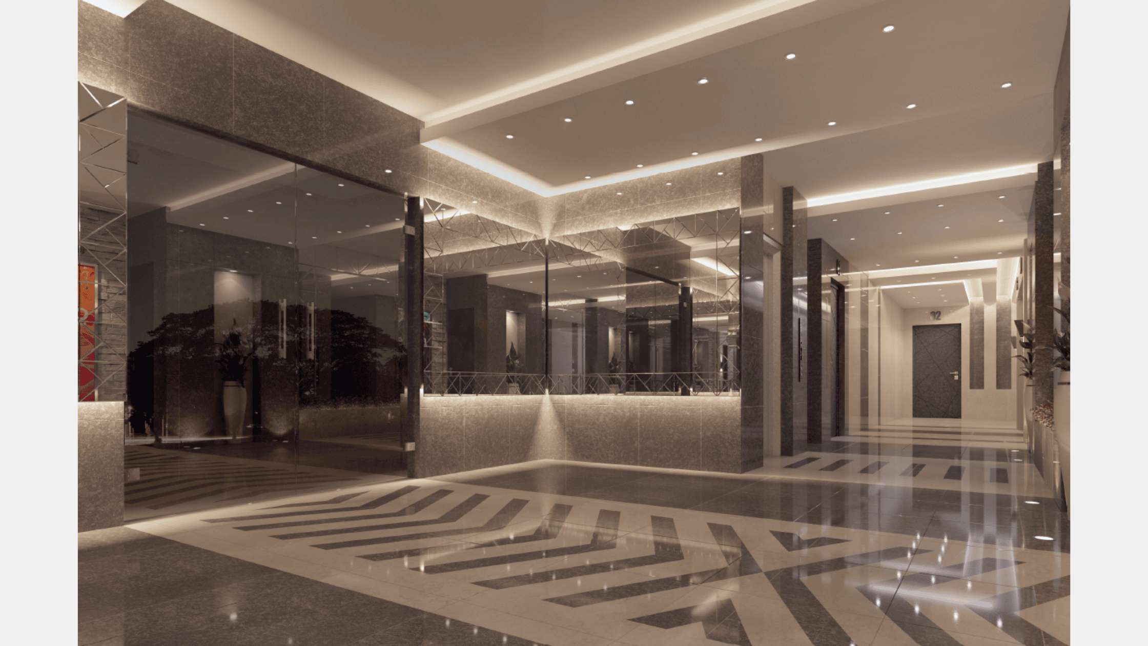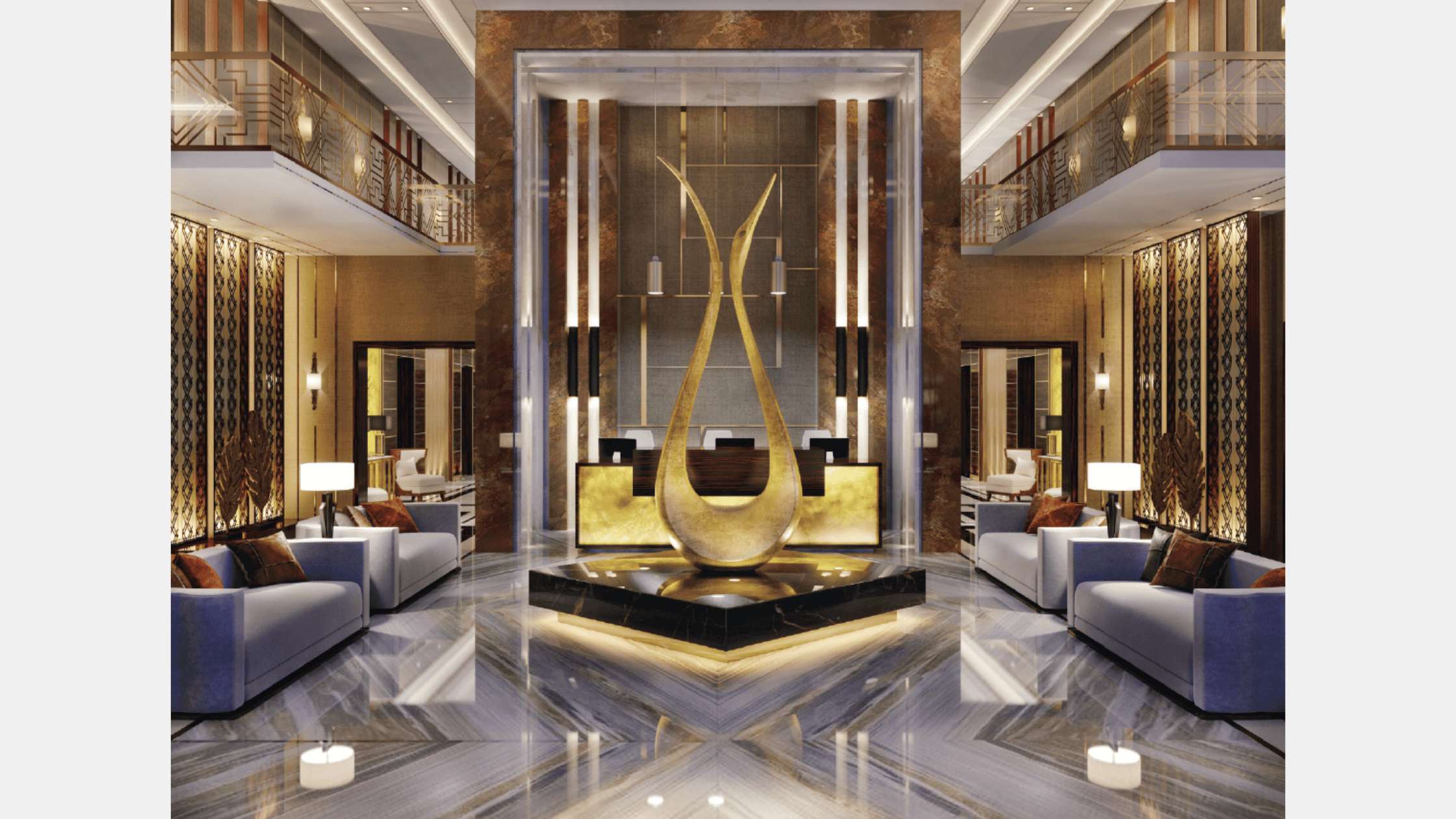 Our Conceptual design for the entrance of the building aims to create a luxurious design for such a luxurious compound that reflect in the mean while the sun theme of the compound . And create this through golden marbles and wooden strips and make the logo centralize these facades to strengthen the identity of the compound.