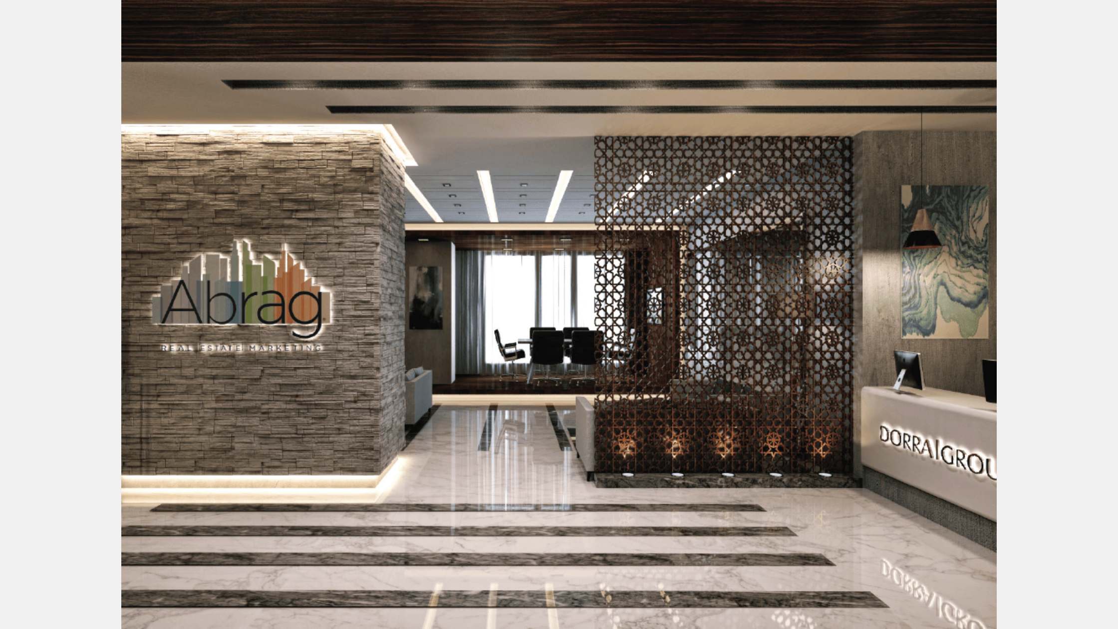 Abrag is the sales office of dorra group in mohandseen, cairo, Egypt. our main design concept is to create a luxurious design that can reflect a suitable image for the company in parallel with achieving the most functionality and practicality for the office. Our design approach depends on using luxury materials that reflect the sense of richness and also be very comfortable for the employees and the customers of the company